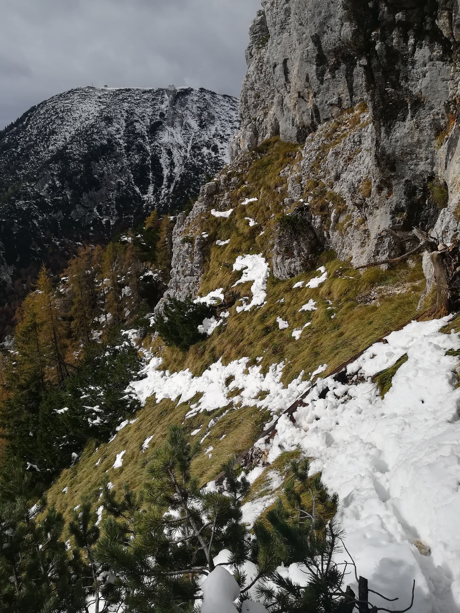 Prvi plan odleti že na izhodišču. Tak, kjer se odcepi pot proti Medvedovi jami je bila postavljena mobilna žičnica za spravilo lesa. Ker je varnost na prvem mestu in pod žičnico menda ni pametno hodit, jo udarimo naravnost gor. Začetni del poti je spremenjen v vlako (ne vem, morda je bilo vedno tako). blatne vlake končno zmanjka na cca 1250m, oz, zavije levo v smeri Kriške planine, pot gre naravnost. Na cca 1400m se iz markirane odcepi lovska stezica mimo Deca. Na nekaterih mestih je bolj za tipat, kot gledat. Z nekaj občutka gre. Pred nami je danes že hodil nekdo, ki je jedel mandarine...in vsake toliko pustil sled ;) Na snegu je bilo sledi seveda več. Za Decom kar strmo zagrizemo v breg, ponekod je potrebno tudi uporabit roke, desno za tem skokom pa je bil rahlo zoprn del. Prečenje strmega travnika. Mokra trava, za nameček je na stezici še nekaj snega. To je bil edini del, za katerega lahko rečem, da tudi objektivno gledano nekoliko nevaren.
